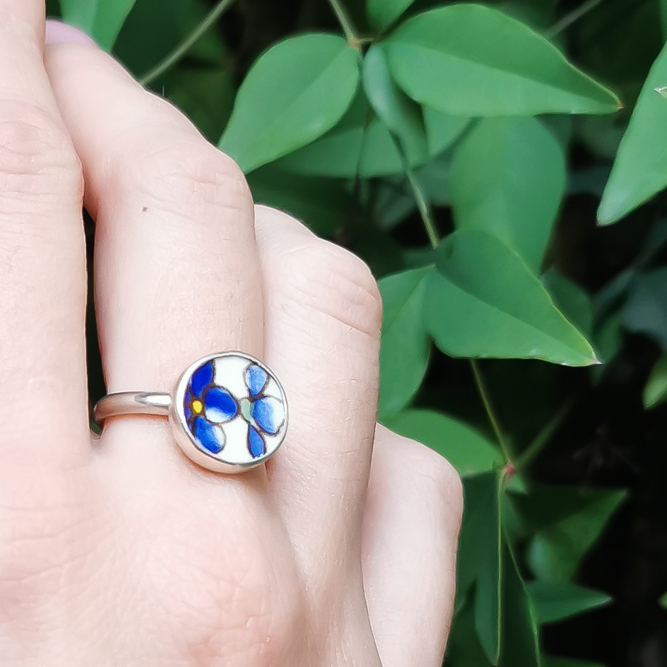 Bague en argent et céramique en taille 57, la ceramique affiche de jolies fleurs bleus. Entierement faite à la main.