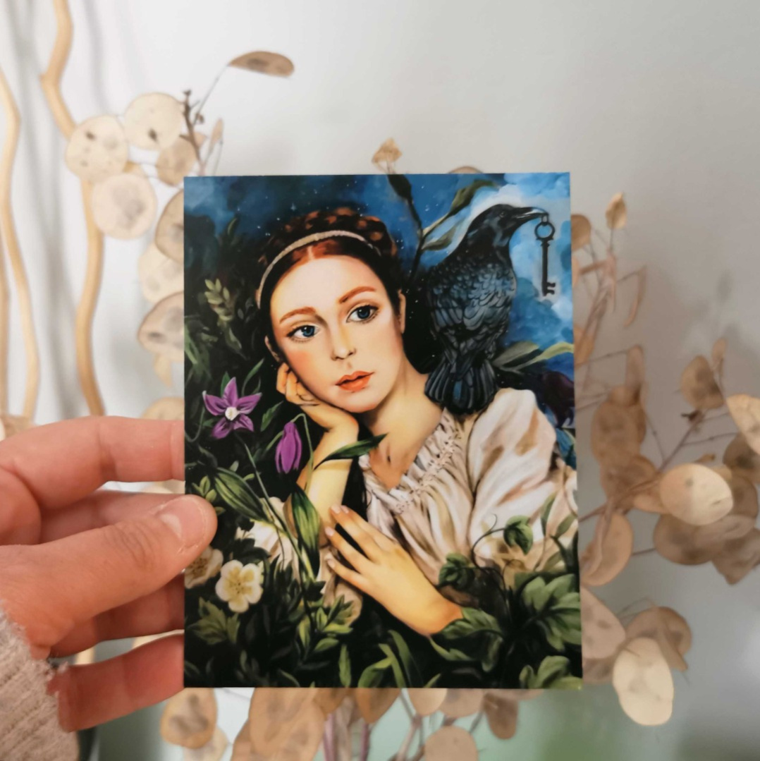 Reproduction hd sur carte d'un portait de sorcieres avec un corbeau et une clef. Couleurs mat