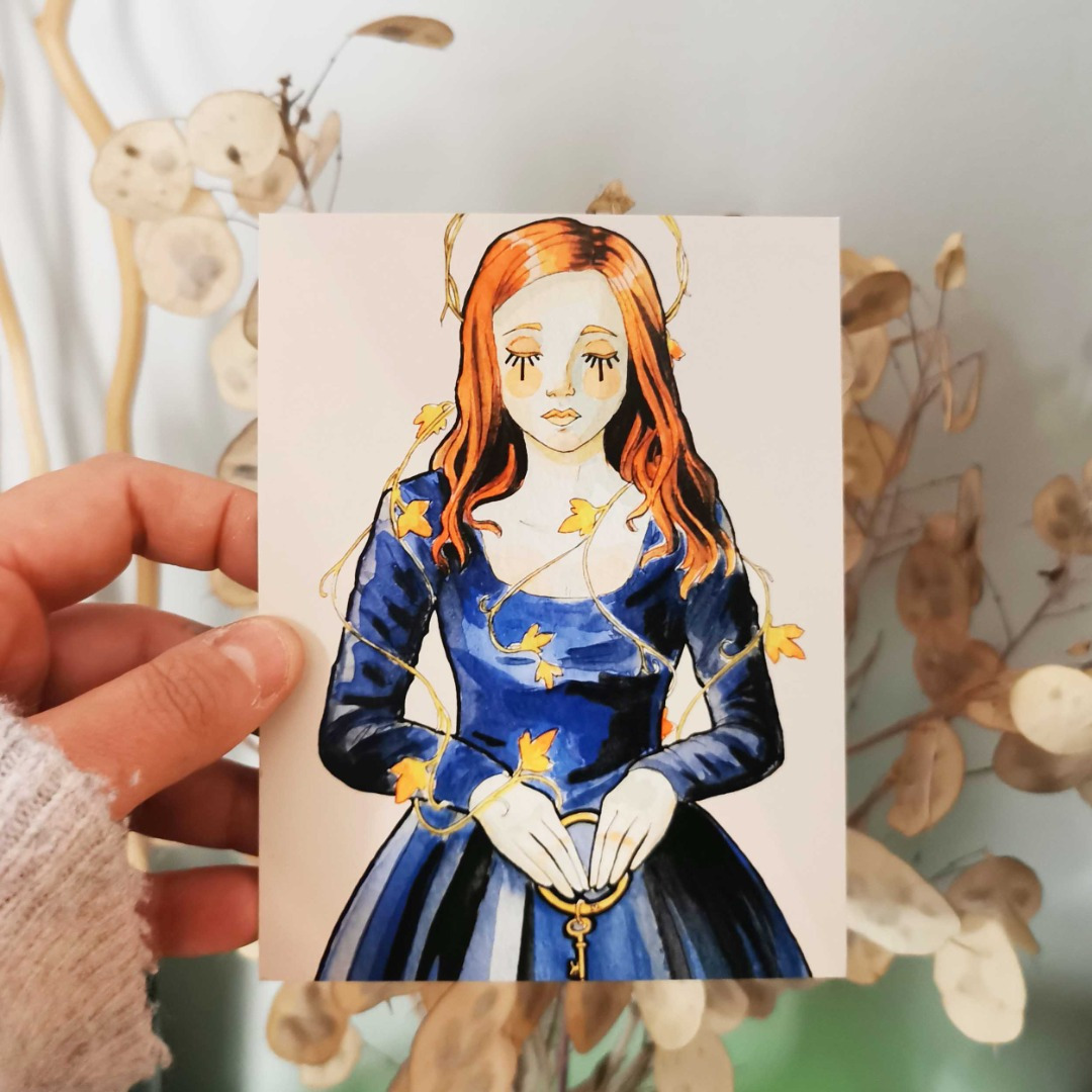Reproduction sur carte d'une femme mysterieuse détenant une clef