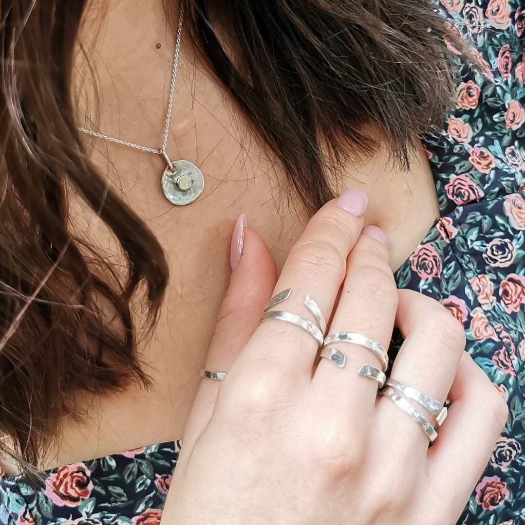 Réalisé à partir de mes chutes d'argent que je fait fondre en petites médailles que je viens marteler 😊 de nombreuses pierres sont disponibles 💎 à choisir en fonction de votre intuition 😌