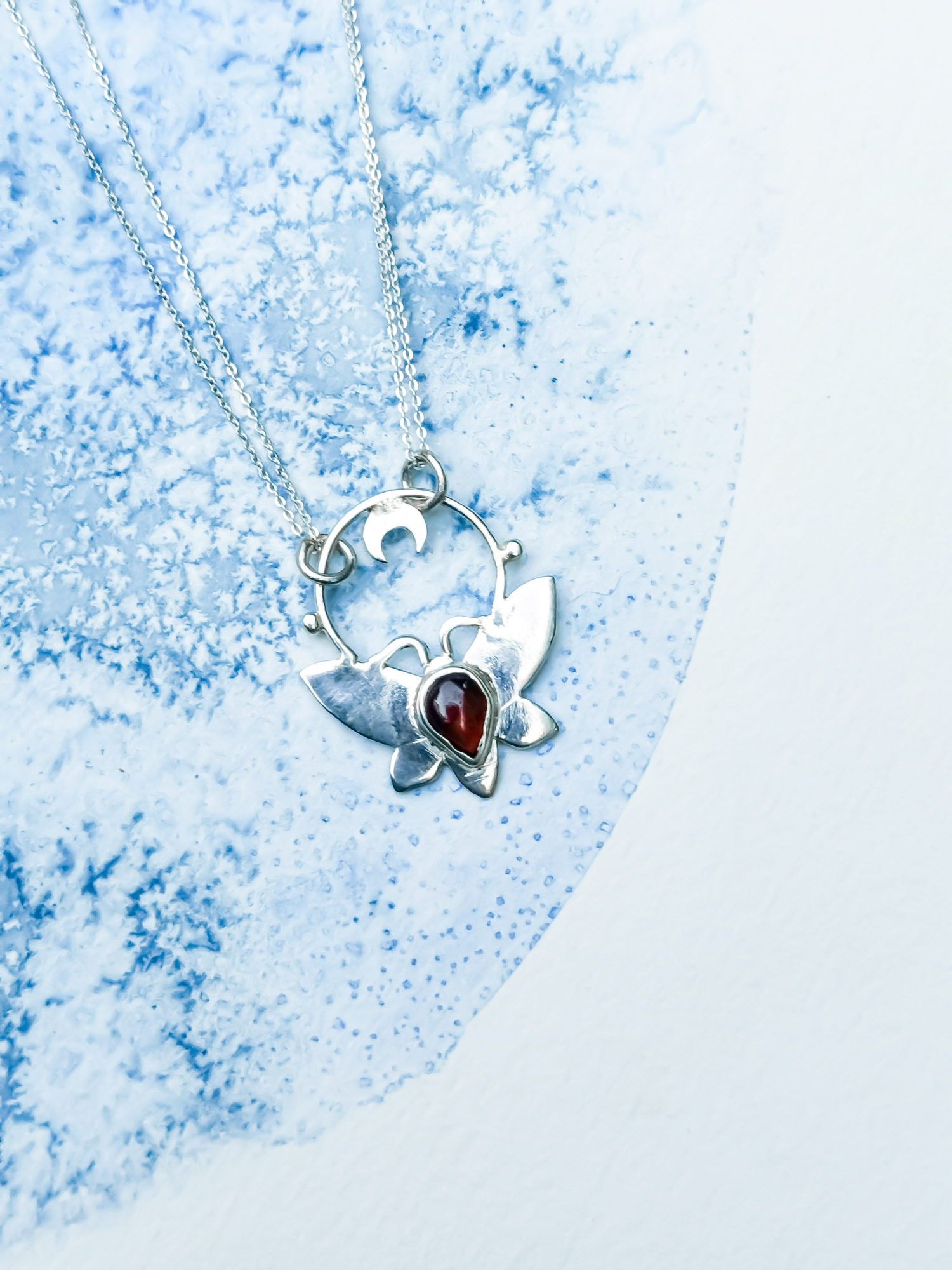 Talisman papillon de nuit en argent 925 et son grenat rouge profond.