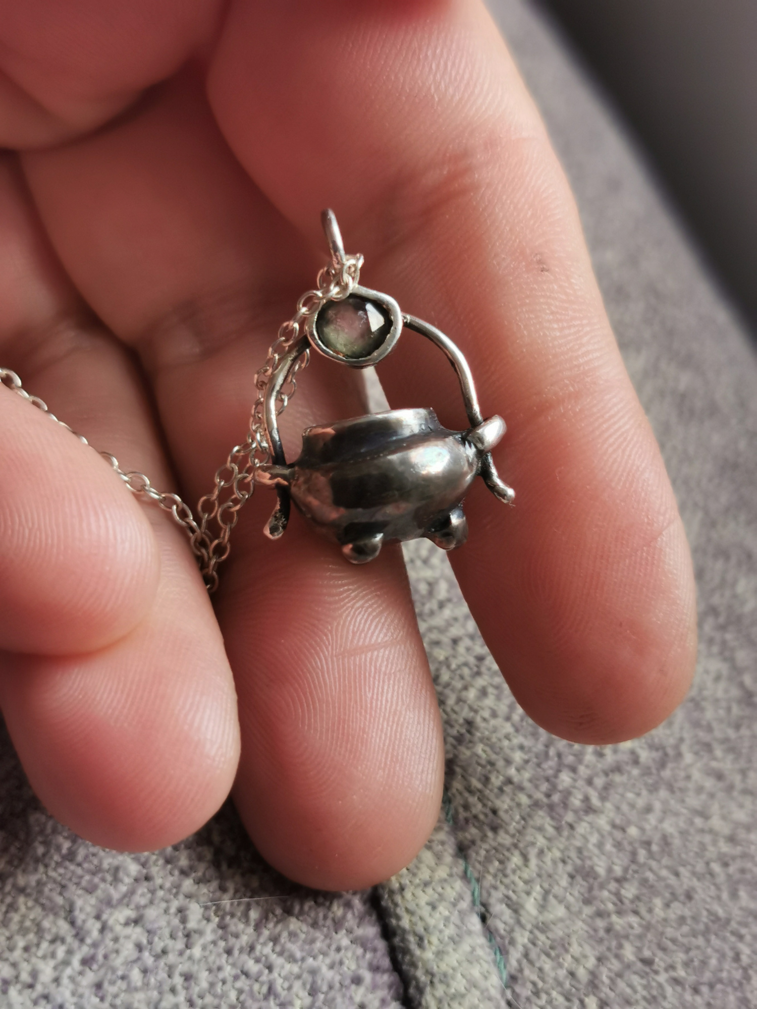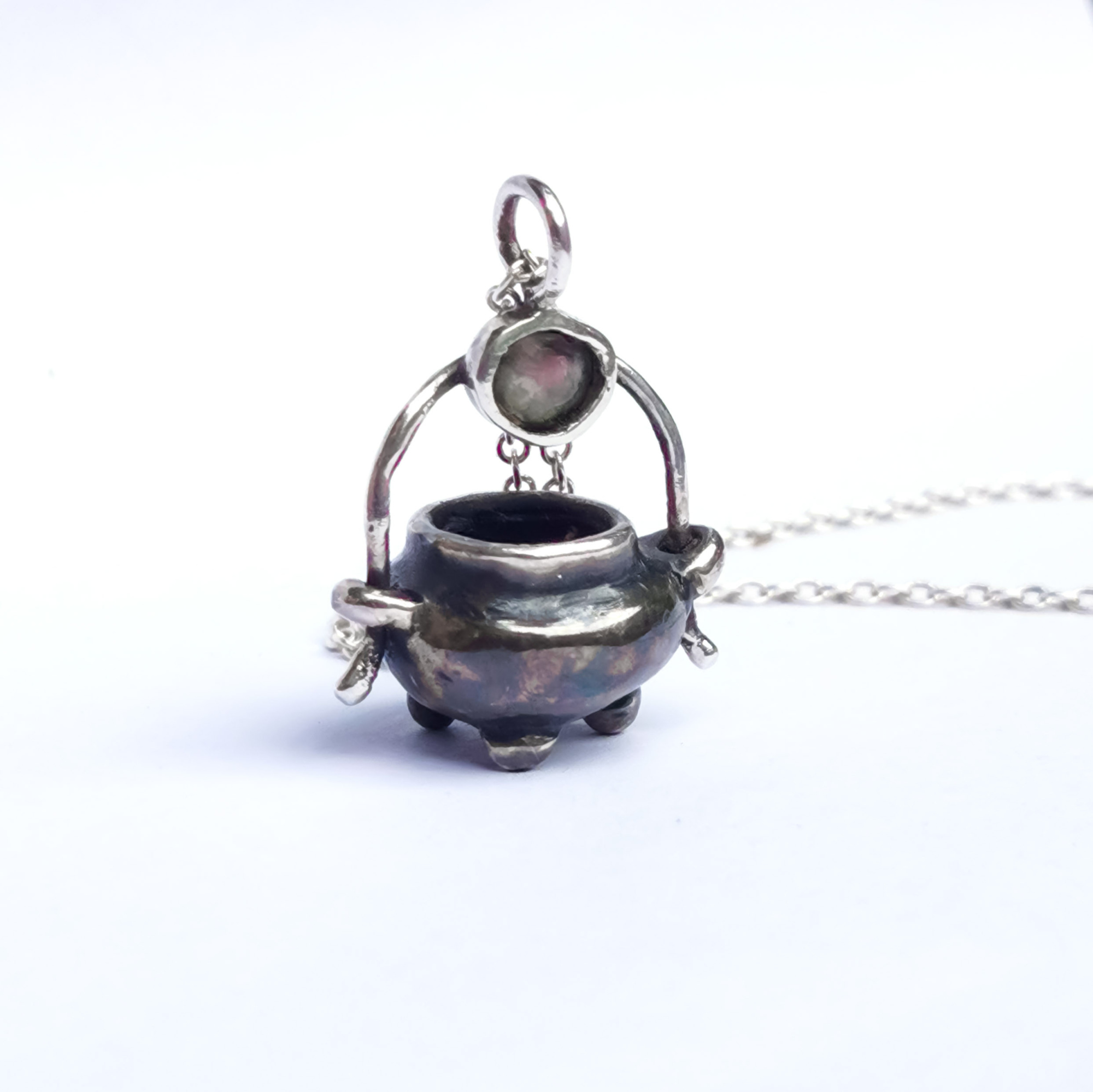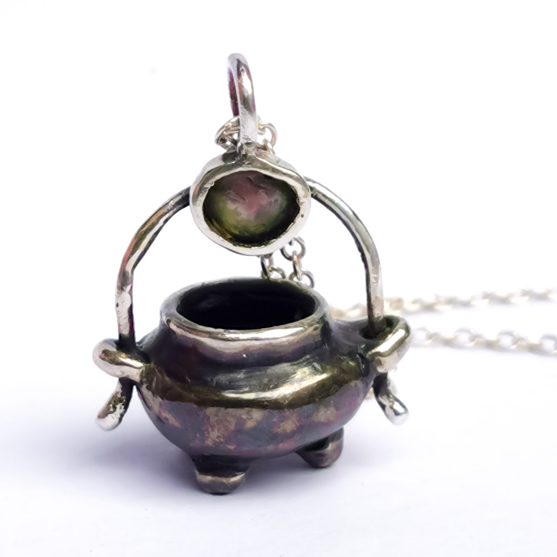 Laissez-vous séduire par cette pièce unique : un chaudron miniature en argent, entièrement façonné à la main, avec une tourmaline délicatement serti sur sa anse.