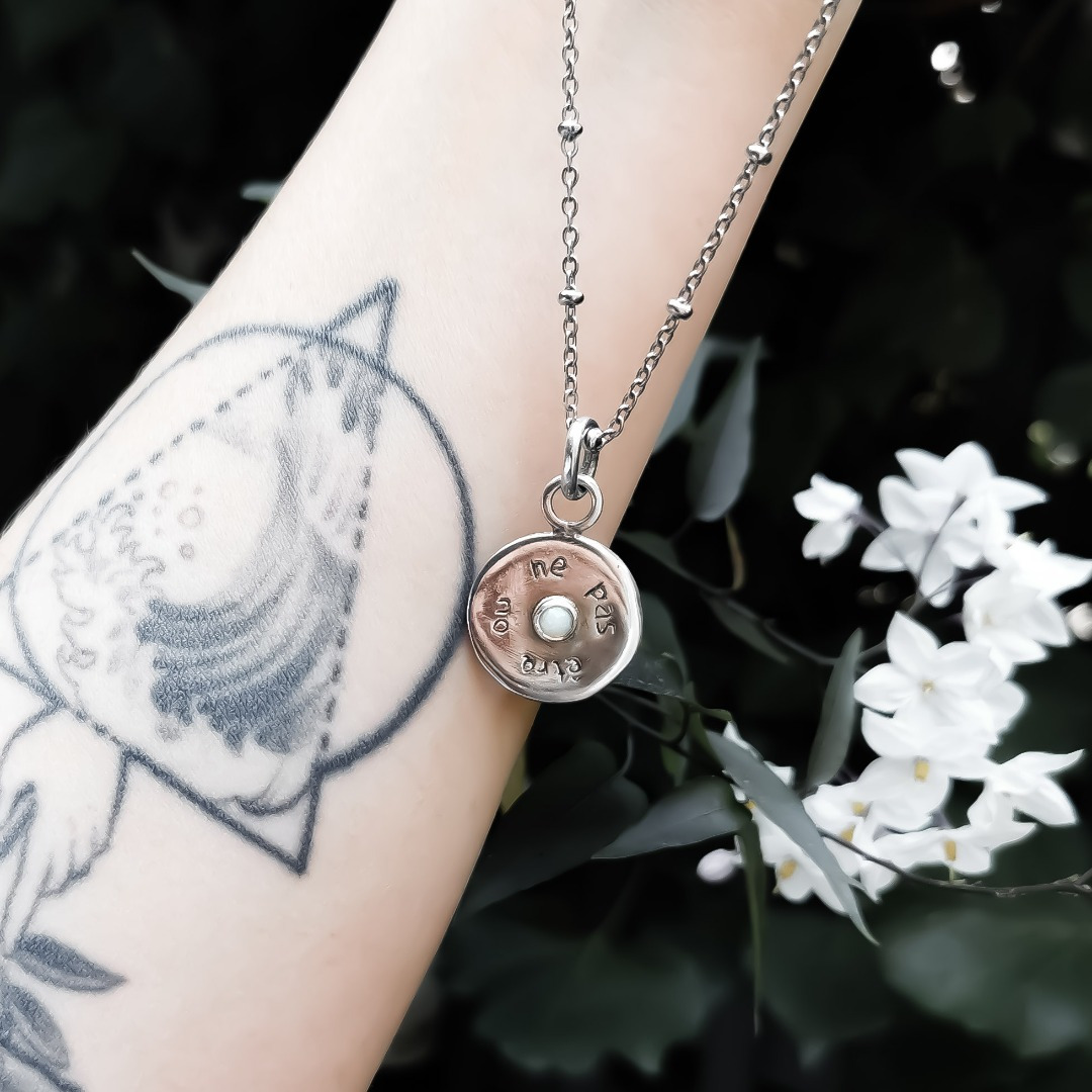 Une incroyable médaille d'argent gravée d'une déesse de la Lune, qui, comme un petit talisman, veille sur vous 😌 et au dos de cette médaille est inscrit ''être ou ne pas être'' autour d'une pierre semi-précieuse. 💭