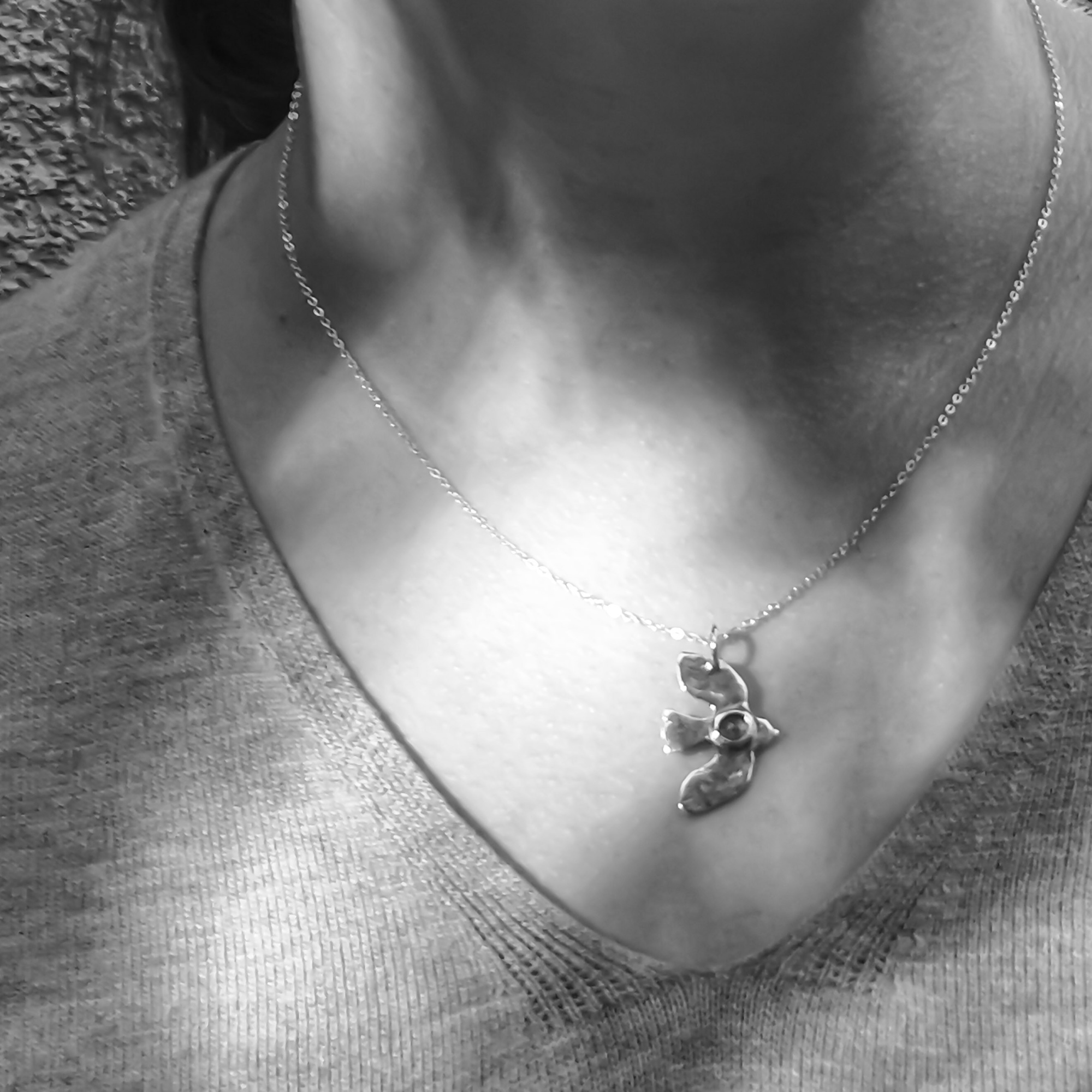 Ce pendentif en argent 925 martelé, façonné à la main, capture cette essence sauvage et instinctive. Son corps épuré rappelle l’art primitif, où chaque ligne va droit à l’essentiel. En son centre brille une tourmaline pastèque, pierre d’harmonie aux nuances de rose et de vert, unissant le cœur et l’esprit.