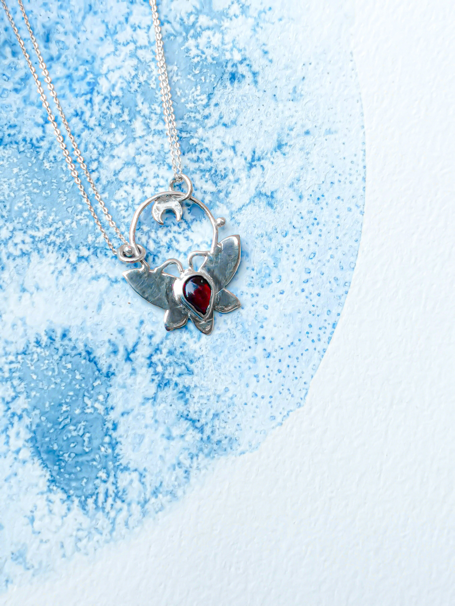 Talisman papillon de nuit en argent 925 et son grenat rouge profond.